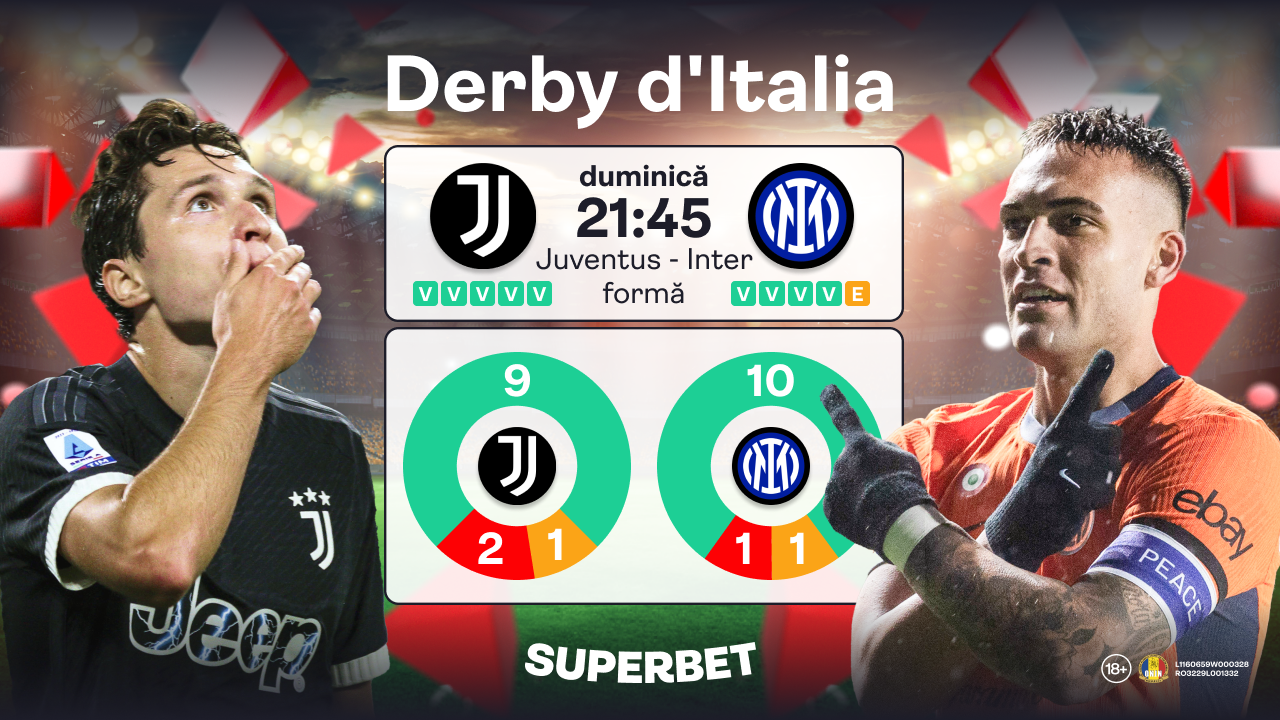 Unul dintre cele mai anticipate meciuri ale sezonului din Serie A va avea loc duminică seară, începând cu ora 21:45. Derby d’Italia va aduce faţă în faţă primele două echipe din clasament, cu o diferență de doar două puncte între Juventus și Inter, avantajând echipa nerazzurra.