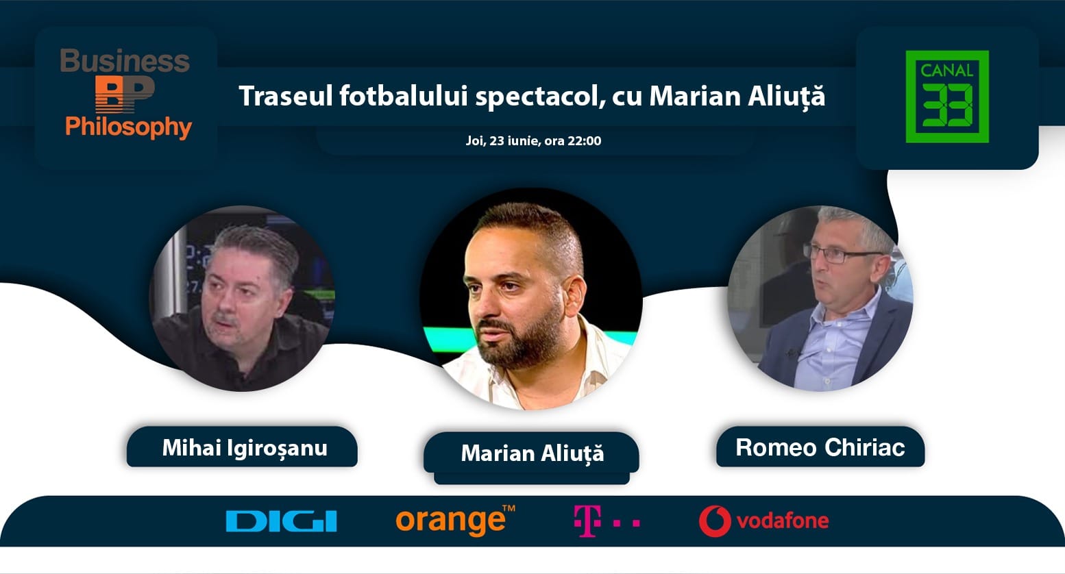Emisiunea Business Philosophy de la Canal 33, programată joi, 23 iunie, de la ora 22:00, îl va avea ca invitat pe fostul fotbalist internațional Marian Aliuță.