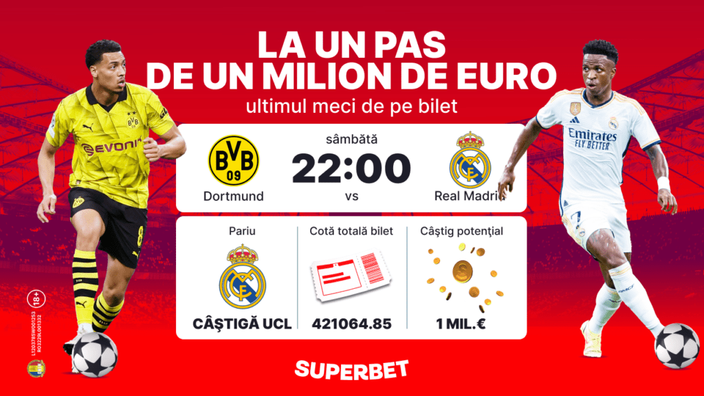 Viziune, inspirație, curaj. Sunt calitățile care l-au dus pe un parior Superbet aproape de statutul de milionar în euro grație unui bilet fabulos, cu 12 evenimente Antepost și o cotă totală de 421064.85 repetat de cinci ori într-o agenție din Brașov! Și nu-și putea alege un meci mai bun pentru desăvârșirea operei decât finala Ligii Campionilor dintre Real Madrid și Borussia Dortmund, partidă în care eroul finalului de sezon speră că „galaticii” vor câștiga a 15-a Cupă cu Urechi din palmares și îi vor schimba viața.