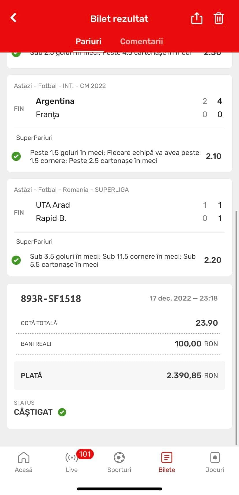 Secțiunea de SuperPariuri continuă să ne ofere variante extrem de numeroase și de diversificate, iar misiunea de a descoperi variante interesante este mult simplificată. Pentru acest Superbilet am folosit variante pe toate cele trei meciuri din Superliga României și, evident, finala Supermondialui din Qatar🍀
