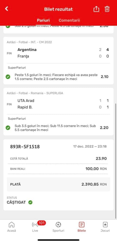 Secțiunea de SuperPariuri continuă să ne ofere variante extrem de numeroase și de diversificate, iar misiunea de a descoperi variante interesante este mult simplificată. Pentru acest Superbilet am folosit variante pe toate cele trei meciuri din Superliga României și, evident, finala Supermondialui din Qatar