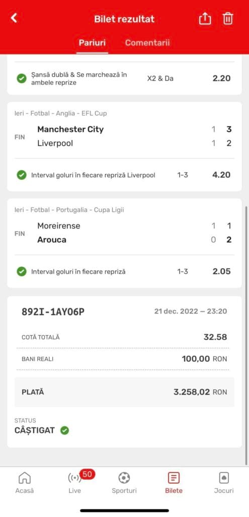 Patru evenimente inspirat culese din Superoferta zilei de joi, profitând și de diversitatea variantelor oferite, 14 Superjucători la fel de inspirați pentru că au copiat biletul și un câștig oferit de o cotă consistentă. Mai ales cea de 4,20(!) de la derby-ul City – Liverpool🍀