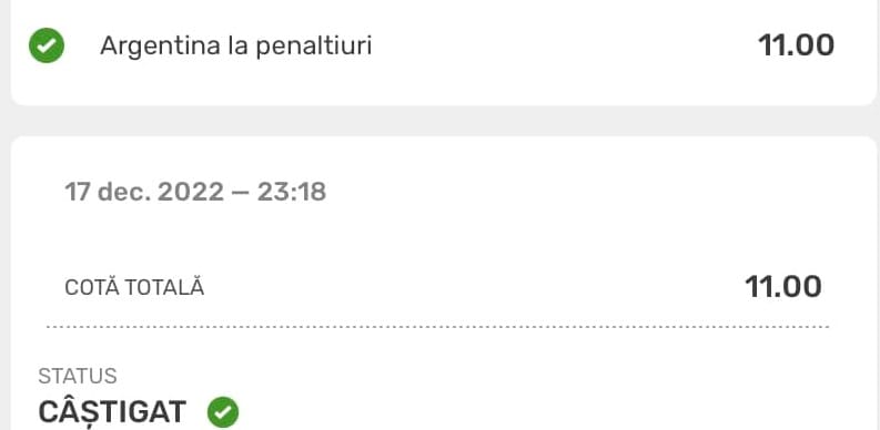 SuperMondialul s-a încheiat aseară, iar Superinspirația a funcționat perfect în alegerea variantei perfecte din Superoferta pe finala Argentina – Franța. Am anticipat triumful echipei lui Leo Messi după loviturile de departajare și ne-am despărțit cum se cuvine de Campionatul Mondial din Qatar. Cu o cotă 11!!!😉🍀
